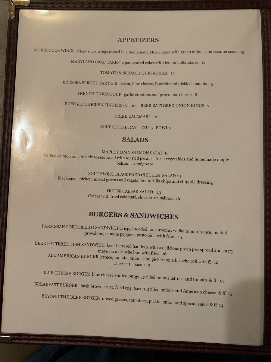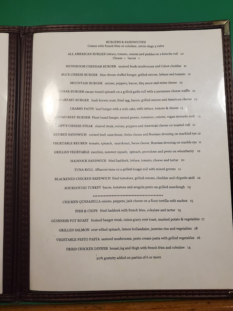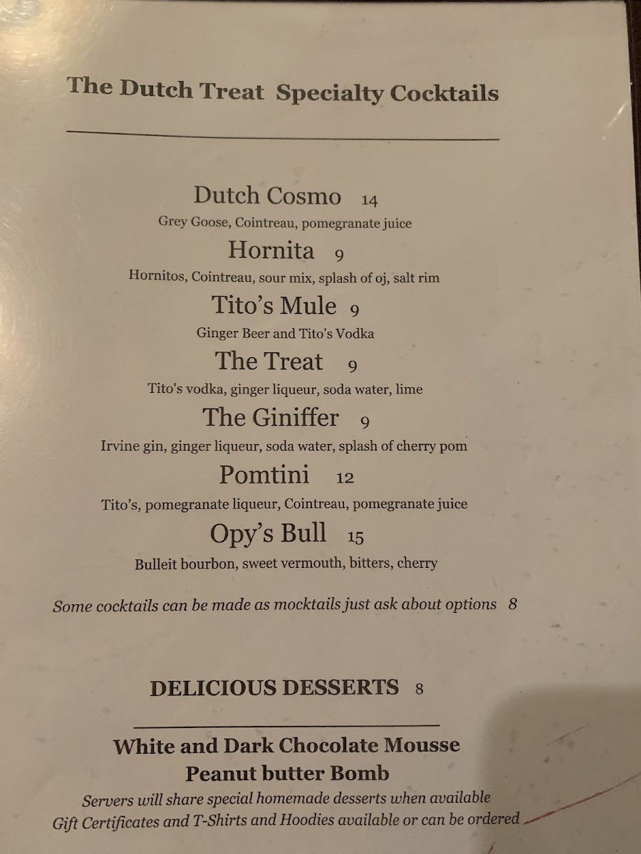 From a reviewer’s perspective, the menu at Dutch Treat feels like a confident summary of what the restaurant does best: approachable comfort food with enough variety to satisfy almost any diner. The experience often starts strong with appetizers like Bacon & Chive Tater Kegs, Homemade Crab Fritters, Maryland Crab Cakes, or the crowd-pleasing Korean BBQ Chicken Wings, all of which set a casual yet indulgent tone. The salad selection, including Cobb Salad, Caesar Salad, Summer Salad, and Caprese Salad with Grilled Salmon, offers lighter, well-balanced options without feeling like an afterthought. Burgers and sandwiches clearly anchor the menu, from the All American Burger and Blue Cheese Burger to the more creative Breakfast Burger, Parmesan Portobello Sandwich, and Beer Battered Fish Sandwich, each designed to be hearty and satisfying. On the mains side, dishes such as Guinness Beef Stew with Puff Pastry, Crispy Chicken over Mashed Baby Red Potatoes with Cream of Porcini Mushroom Sauce, and Bison Ragu over Pappardelle Pasta show a willingness to go beyond standard pub fare while still keeping flavors familiar. The drink menu rounds everything out thoughtfully, featuring draft and craft beers like Allagash White, Fiddlehead IPA, and Guinness, alongside accessible wines such as Josh Cabernet and Woodbridge Chardonnay. Classic spirits, specialty cocktails like the Dutch Cosmo and Tito’s Mule, and refreshing mocktails including Sweet Diana and Rosemary Mule ensure that every guest finds something to enjoy. Overall, the Dutch Treat menu comes together as a well-rounded conclusion to the dining experience-comforting, generous, and clearly built to please both locals and travelers alike.